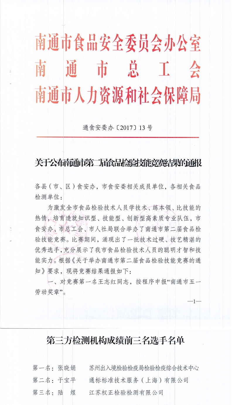 南通市第二屆食品檢驗(yàn)技能競賽我公司檢驗(yàn)人員喜獲佳績