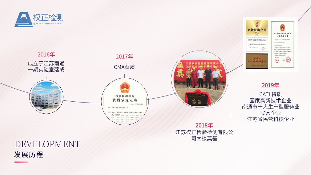 2017年4月22日,剛滿周歲的江蘇權正迎來了江蘇省檢驗檢測機構資質認定現場評審,并順利取得CMA資質認定證書。2018年9月30日,江蘇權正檢驗檢測有限公司大樓奠基。2018年12月,江蘇權正再次接受農產品質量安全檢測機構考核現場評審,并于3周歲前獲取了CATL資質認定證書。一年后,江蘇權正順利通過國家高新技術企業認定,被評為南通市十大生產型服務業名營企業、江蘇省民營科技企業。